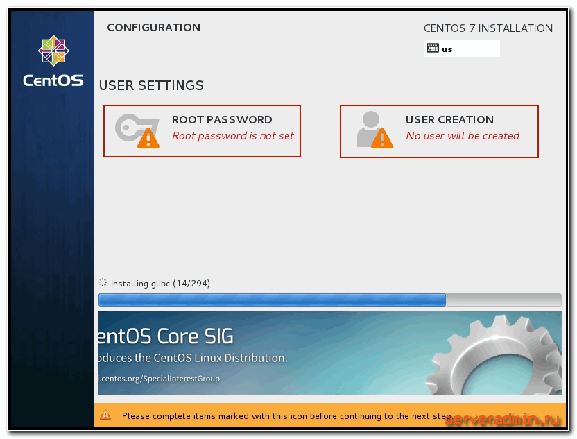 Если вы используете диск centos minimal iso, то увидите следующий экран: Дальше загружается страница с выбором основных параметров установки. Она уже будет отличаться в зависимости от типа ISO образа, с которого происходит установка центос. CentOS 7 minimal Если вы используете диск centos minimal iso, то увидите следующий экран. Здесь вам предлагают указать параметры установки. Восклицательным знаком помечен раздел, без настройки которого продолжение невозможно. Для настройки доступны следующие параметры установки: