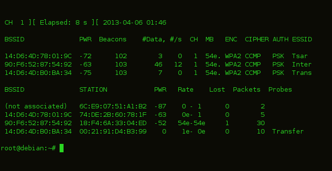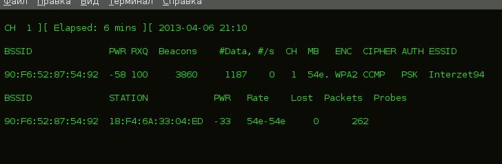 CH- номера канала на котором находится точка доступа(иногда airodump может захватывать пакеты с других каналов, это случается из-за наложения радио частот. MB- скорость передачи данных ENC- алгоритм шифрования CIPHER- тип шифрования AUTH- тип авторизации ESSID- название точки доступа STATION- MAC адрес клиента Lost-число потерянных пакетов за последние 10 секунд Packets- количество пакетов посланных клиентом Probes- названия сетей с которыми пытался соединиться клиент