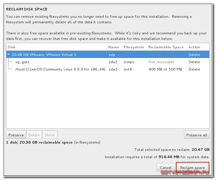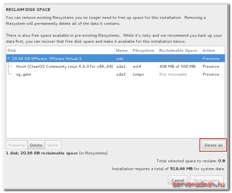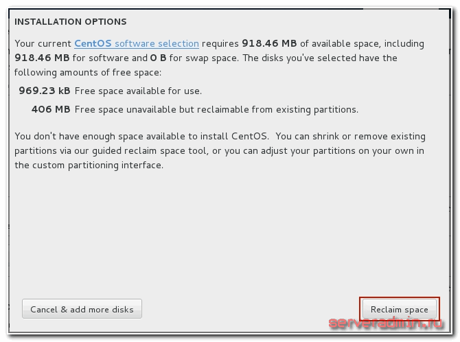 Нам осталось рассмотреть последнюю обязательную настройку, без которой установка centos не начнется —INSTALLATION DESTINATION. Зайдя в нее вы увидите список подключенных к серверу дисков. В моем случае это один жесткий диск.