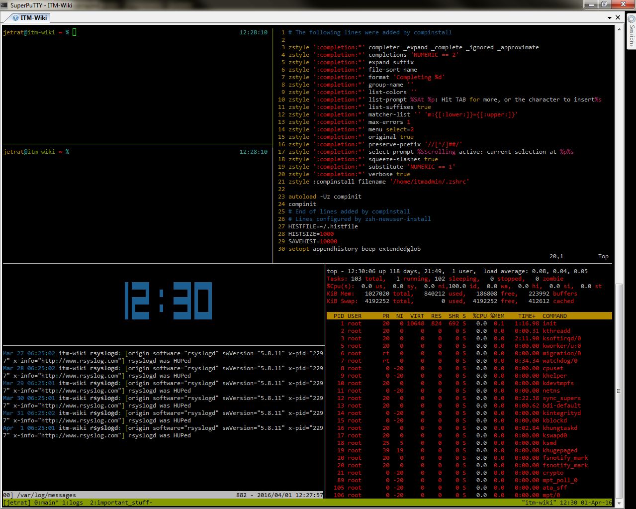 Кроме прочего замечу, что этим функционал tmux не ограничивается. При желании, мультиплексоры можно использовать, допустим, для «демонизации» процессов. Ну, и про возможность конфигурации информационной области тоже забывать не стоит: часы, имя хоста, Load Average, короткая выдача собственных скриптов - любая информация, которую хочется держать перед глазами, может быть помещена сюда.