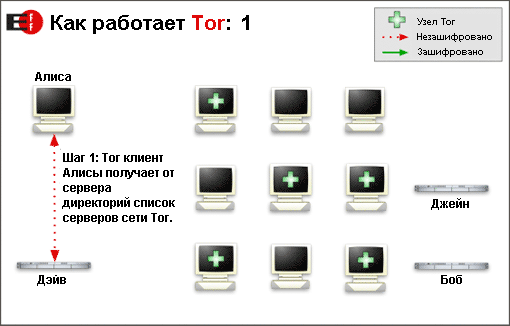 Система TOR - это калифорнийский проект, в настоящее время объединяющий бoлее тысячи серверов по всему свету. Система шифрует передачу сообщений по протоколам HTTP, HTTPS и SOCKS, и обеспечивает вам достаточно анонимную работу в сети Internet. Шифровка осуществляется независимыми ключами между каждой парой компьютеров в сети.