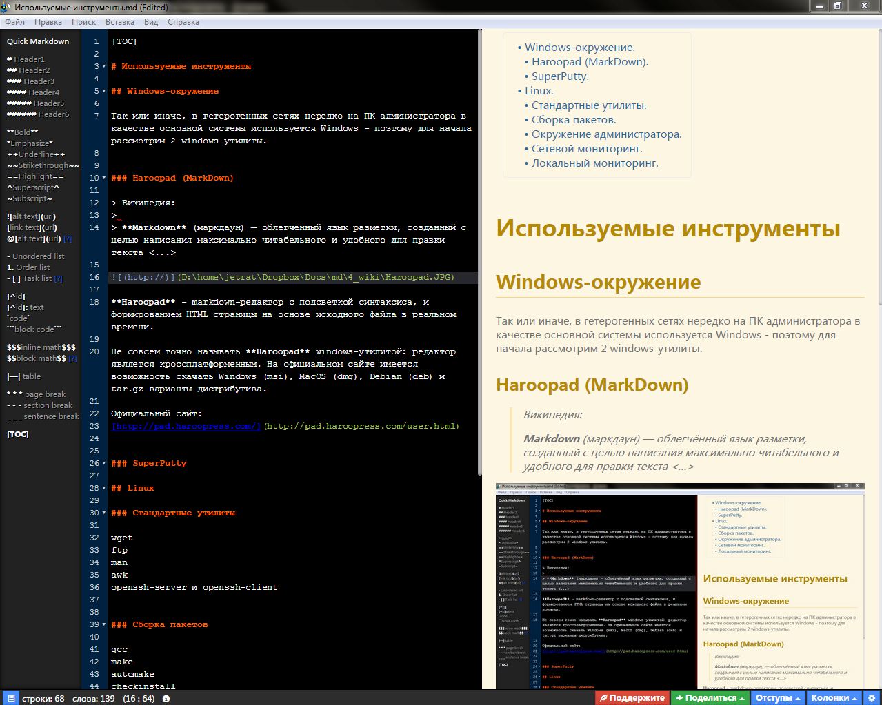 Не совсем точно называть Haroopad windows-утилитой: редактор является кроссплатформенным. На официальном сайте имеется возможность скачать Windows (msi), MacOS (dmg), Debian (deb) и tar.gz варианты дистрибутива.